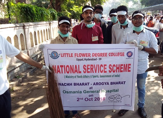 Our NSS Unit volunteers participated in Swachh Bharath –Arogya Bharath program at Osmania General Hospital.This event was organised by State NSS Cell .NSS Cell O.U in collaboration with Seva Bharathi as a part of Gandhiji’s 150th Birth Anniversary. Our NSS volunteers reached this place by morning 8 clock after they provided breakfast for volunteers ,then they divided volunteers in to groups each group they gave all cleaning materials ,volunteers done swachh bharath in Osmania hospital from 9AM to 2PM ,and we made program has grand successes.